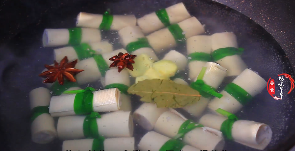 6,鍋裡水開之後下入做好的豆皮卷,放入薑片八角香葉,再來一撮花椒,再加入適量的老抽,攪拌均勻,蓋上鍋蓋中小火煮上10分鐘。