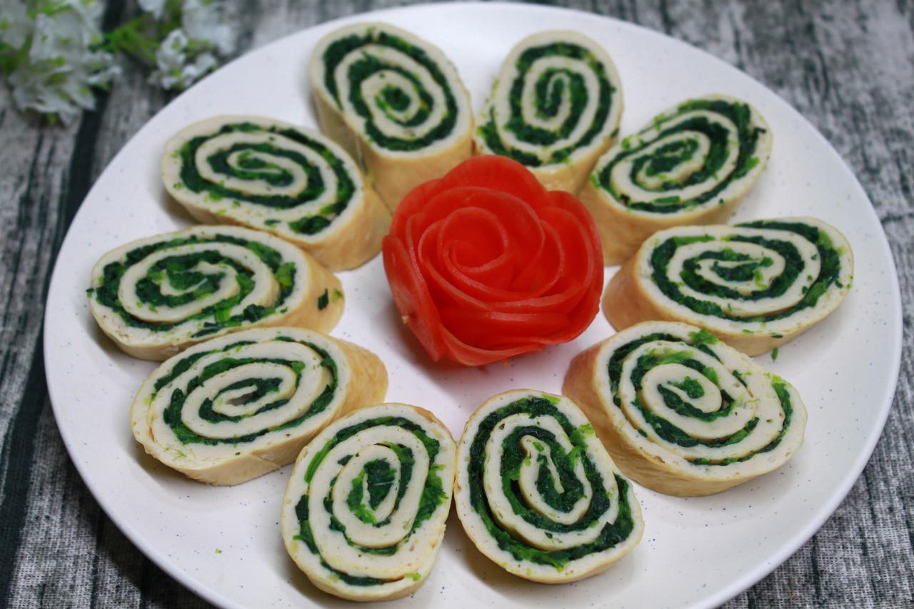 8、這個時候雞肉卷也蒸好了,咱們把它取出來稍微放涼一點,放到案板上斜刀切塊,直接擺入盤中,中間擺上一朵胡蘿蔔花,就可以上桌了。