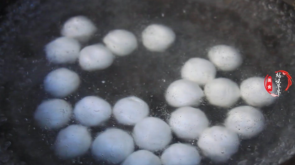 3,鍋裡水開之後,下入湯圓煮熟,輕輕推動一下,煮到湯圓一個個都漂浮起來就可以撈出了,撈出後放入涼水中。