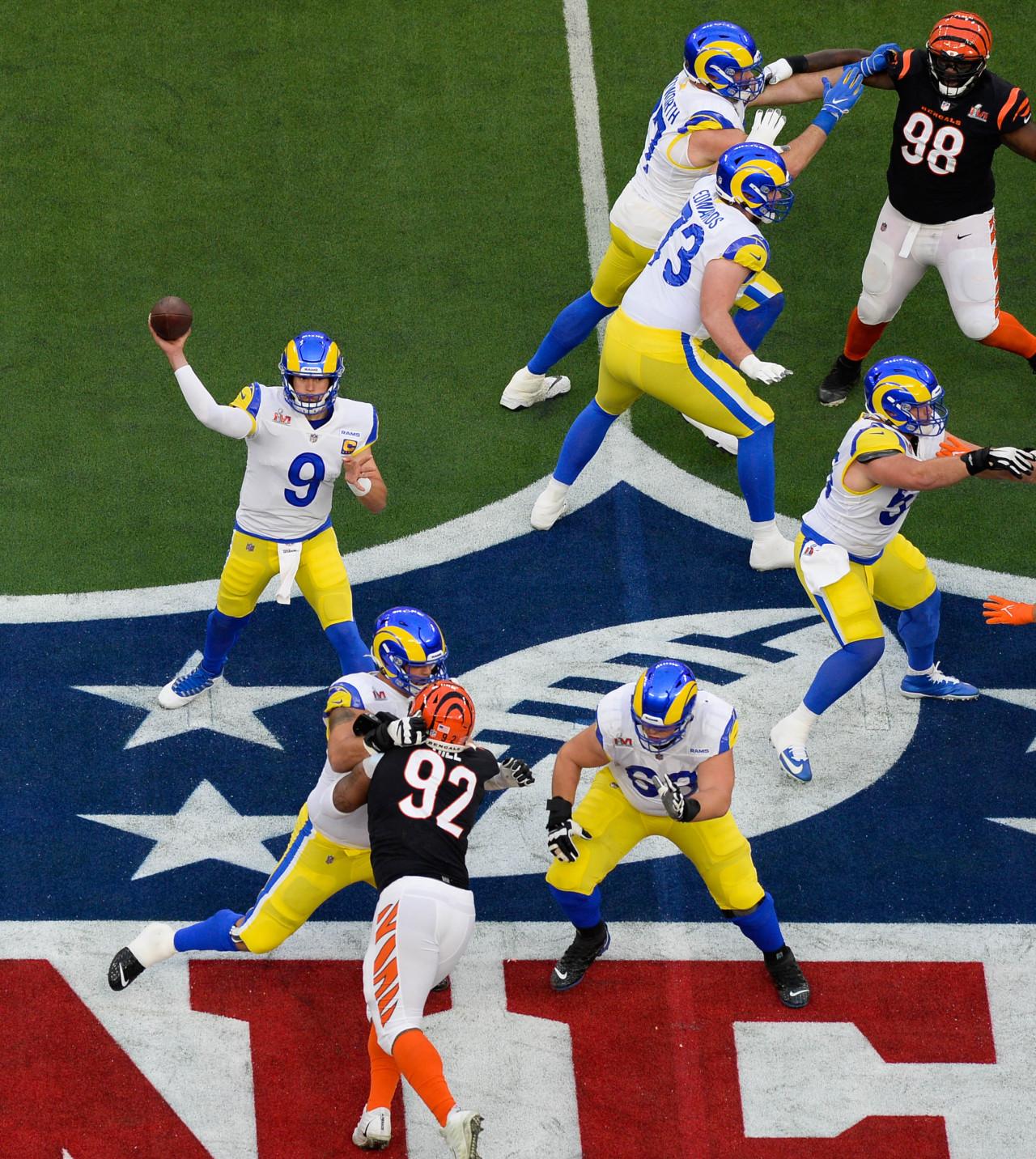 2月13日,洛杉磯公羊隊隊員斯塔福德(左一)持球策動進攻。 新華社發