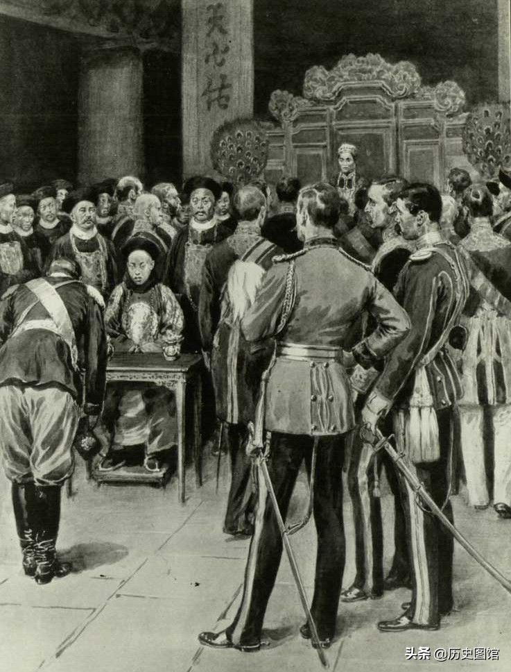 這幅畫裡,表現的是皇帝正在接見外國使者,慈禧太后則坐在後面的龍椅上。這些外國使節,先向小皇帝鞠躬行禮,然後再向後面的慈禧太后行禮。在文武百官簇擁下,場面很是氣派。小皇帝坐在椅子上,一臉不屑地看著一群前來參見的外國公使,有的外國人還掛著佩劍。