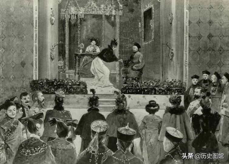 這幅畫,描繪的是一群西方特使攜夫人覲見慈禧太后。慈禧太后正襟危坐,金碧輝煌的大殿裡,站滿了不遠萬里來到中國的西方人。他們依次上前拜見,並送上精心挑選的禮物。
