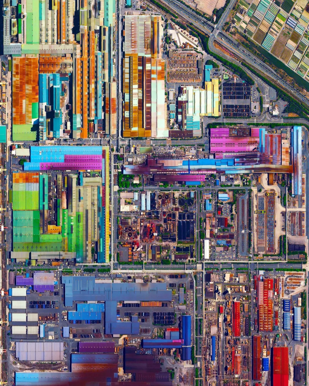 日本一座城市的一個工業園區有一個彩色的屋頂,從太空看就像一個整合電路板……