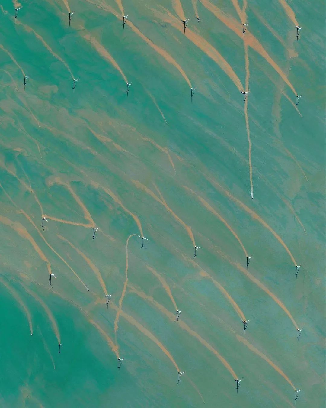 隨著潮水的到來,上海東海大橋海上風電場的渦輪機周圍會形成條狀的沉積物。它也是中國第一個商業海上風電場,能夠為20萬個家庭供電。