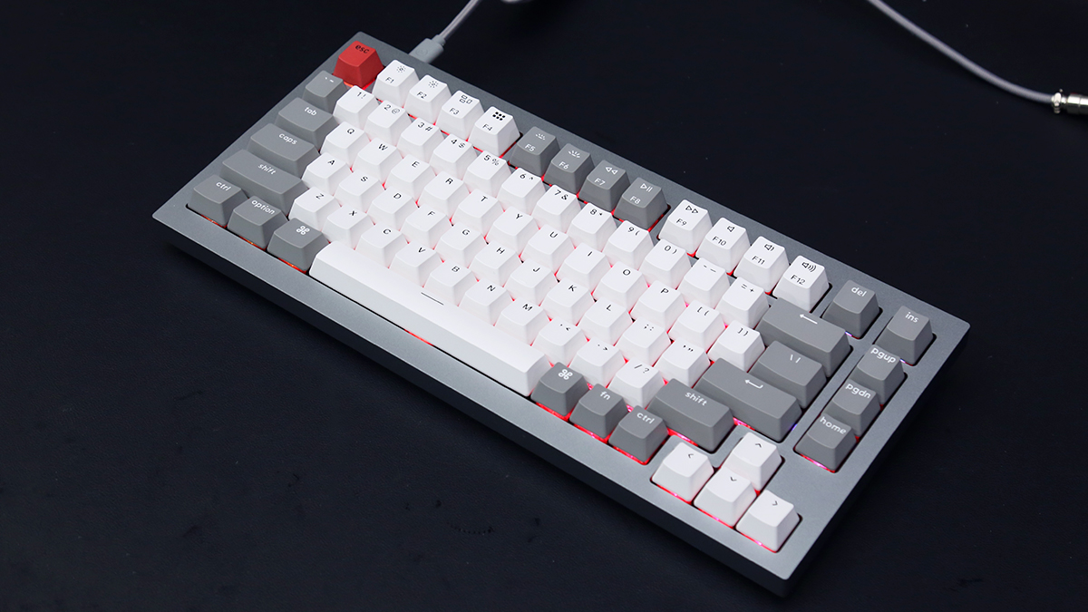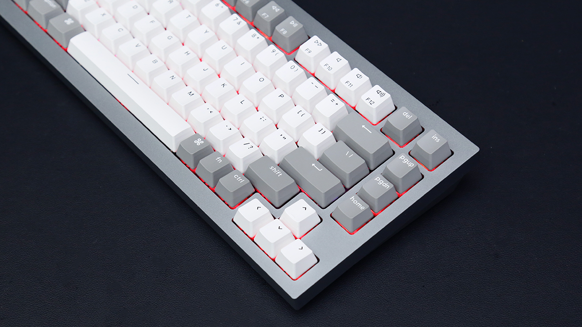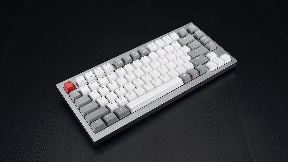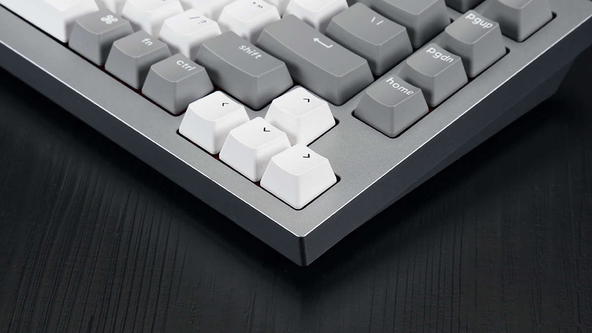 Keychron-Q1全鋁客製化機械鍵盤採用了75% 配列,82鍵位佈局,在滿足日常輸入需求的同時,刪減了數字鍵區以及部分功能鍵,進一步縮小了機身尺寸,減少了桌面空間的佔用。機身採用了CNC全鋁合金外殼,表面採用陽極氧化處理,細膩的磨砂工藝,在機身質感、觸感上都有著極佳的表現。機身採用了銀灰配色風格,搭配灰白配色的鍵帽看來簡約乾淨,還是非常討好使用者眼球的。機身線條硬朗幹練,較寬的邊框也更加符合當下鍵圈使用者的審美喜好,整體外觀表現還是相當出彩的。