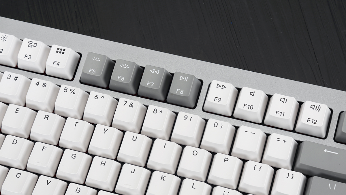 鍵帽部分搭配了一套ABS二色注塑鍵帽,OEM高度方案,不支援透光。鍵帽整體做工與細節處理還是很不錯的,水口、毛刺處理都非常乾淨,也沒有明顯的彎曲破損。鍵帽觸感細膩順滑,手感表現極佳,二色注塑工藝也讓鍵帽字元更加清晰耐用,抗磨損表現上也有著不小的提升。