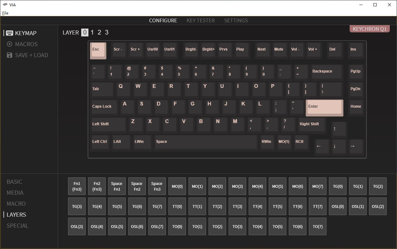 Keychron-Q1全鋁客製化機械鍵盤採用了客製化鍵盤常用的QMK韌體方案,機身內提供了4個鍵位邏輯層,分別對應Win和Mac OS兩種不同的作業系統,提供了基礎層及FN組合鍵層。使用者也可以根據個人使用習慣來自行編譯符合個人使用習慣的鍵位邏輯層。動態鍵值修改軟體VIA也對這款鍵盤進行了適配,使用者可以透過圖形化的軟體來輕鬆調整鍵位設定、按鍵宏等功能,還是非常方便的。