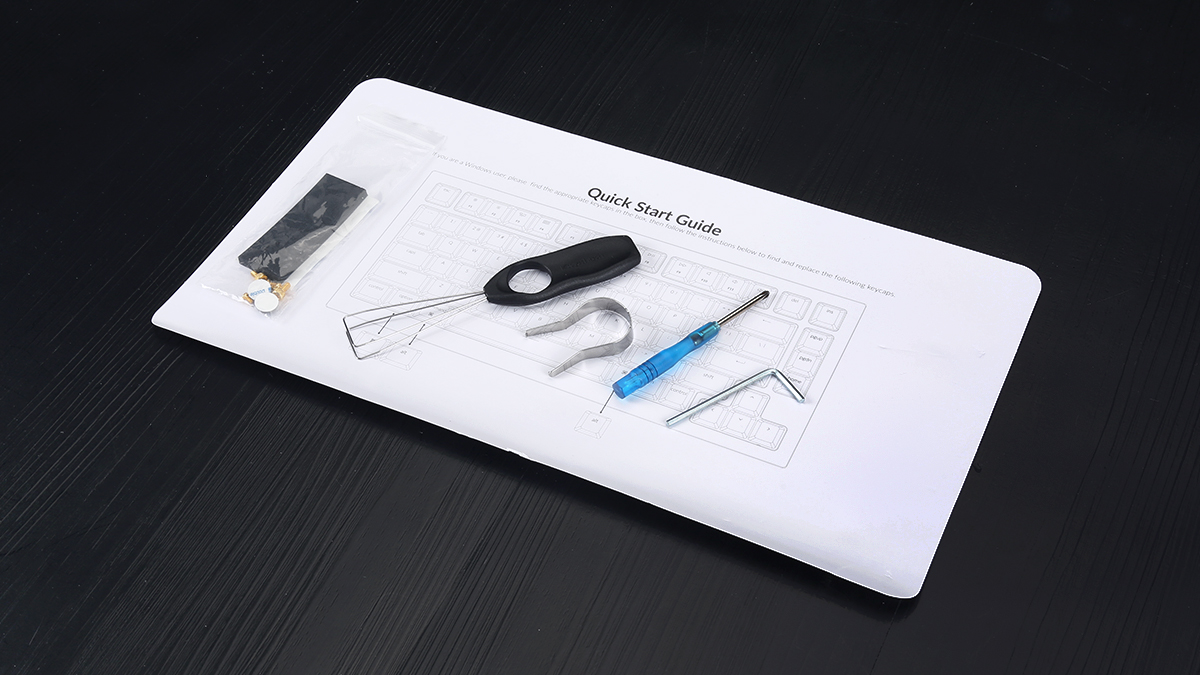 附件方面提供了快速入門說明書、使用者手冊、軸體宣傳卡、USB type-C螺旋航插線、替換鍵帽等常規附件,包裝內層還提供了拔鍵器、拔軸器、十字螺絲刀、內六角扳手、改裝所用的緩震腳墊與替換螺絲。附件內容還是非常豐富的,也為這款鍵盤帶來了更多的DIY可玩性。