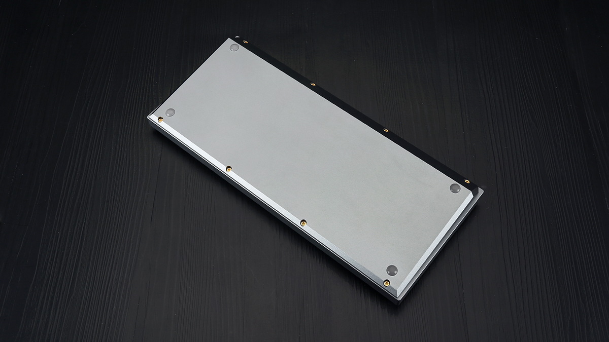 Keychron-Q1全鋁客製化機械鍵盤採用了上下殼結構設計,底殼稍稍小於上蓋的結構方案。底殼表面處理非常平整,四角位置提供了四枚圓形的防滑腳墊,保證鍵盤在不同材質表面放置穩固不易滑動的同時,也能避免底殼磨損。底殼採用了前高後低的傾角設計,可以減少使用者使用時對於手部、腕部的壓力,長時間使用也有著不錯的舒適度。