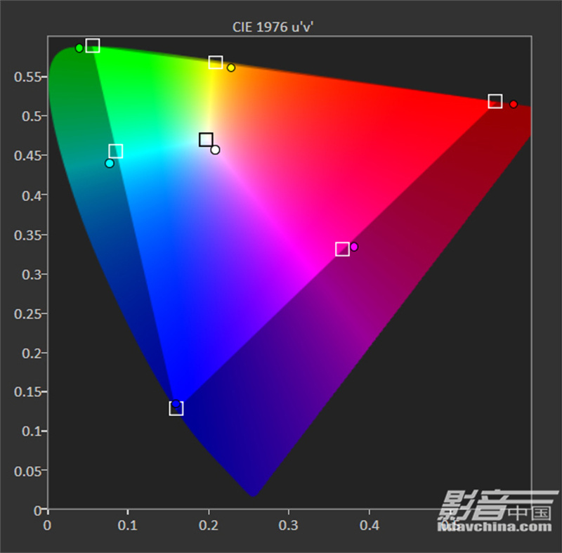 電影預設模式,暖色溫設定,色域覆蓋範圍達到97.83% BT.2020 CIE1976uv,其中紅色飽和度相比標準模式要更為鮮豔