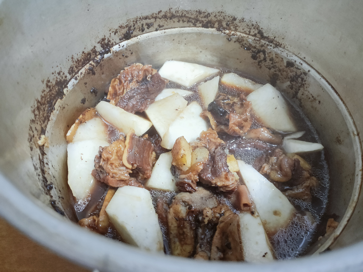 等高壓鍋自然冷卻後,開啟鍋蓋,加入白蘿蔔,繼續燉10~15分鐘左右。蘿蔔志堅,也一定要燉得軟爛才好吃。