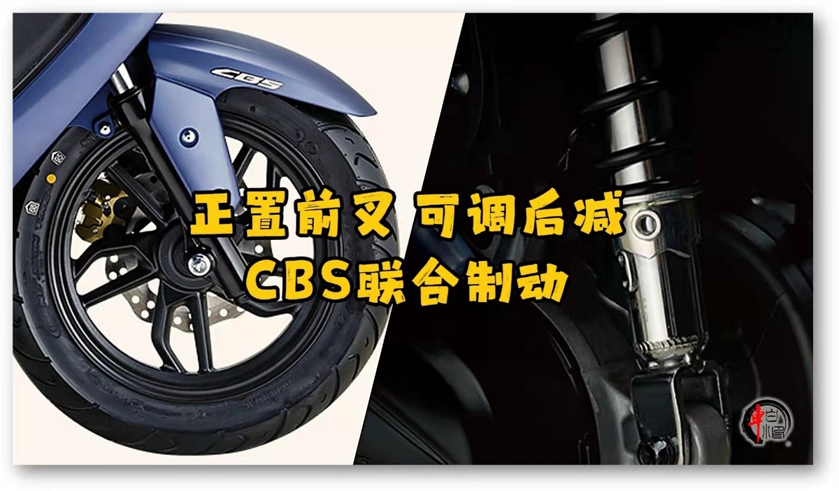 操控方面,前懸架裝配正置式前叉,後懸架採用預載可調後減震,前盤後鼓式制動,前輪雙缸碟剎+浪花碟盤,和AFR一樣採用了CBS聯合制動,能合理的分配前後輪制動力,有效縮短剎車距離,提高安全性。尾箱版本多300元,售價9480元,增加了尾箱和護槓。