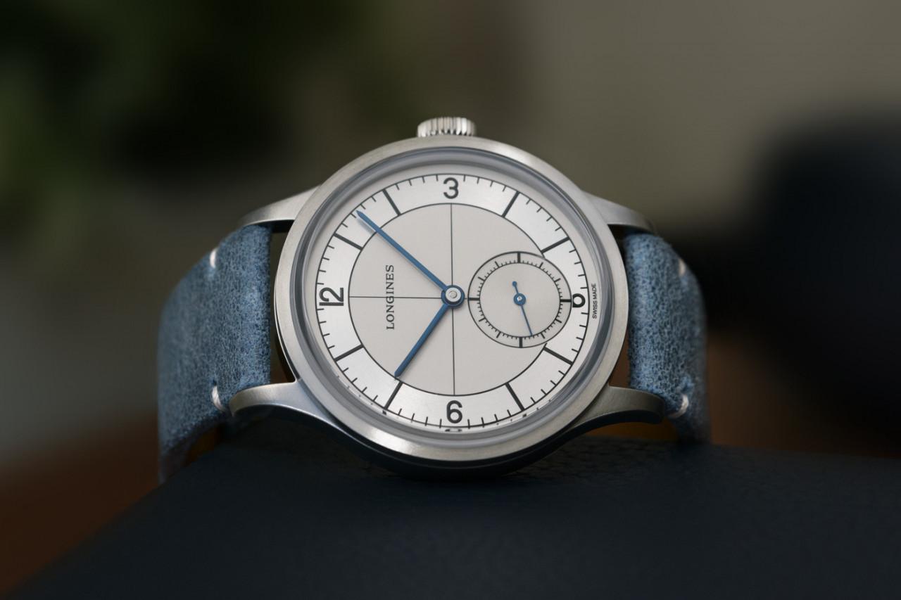 銀色錶盤中央有一個黑色的十字圖案,將其整齊地劃分為四個象限。外圈比中心更深的銀色,在五分鐘標記處有很大的刻度線。較小的單分鐘刻度線位於外圓周圍,3、9 和 12 點鐘位置有粗體數字。時針和分針的長度幾乎相同,呈現藍色,以便觀察。6 點鐘位置有一個 60 秒小錶盤。