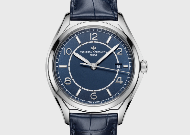 錶盤本身低調,銀色飾面和日期位於 3 點鐘位置。內部刻度線採用黑色長斜線,在 6、9 和 12 點鐘位置設有數字。外部刻度線較小以指示各個分鐘。5 分鐘標記由藍色刻度線表示。時針和分針是鏤空的,尖端很窄,而秒針很長很細。