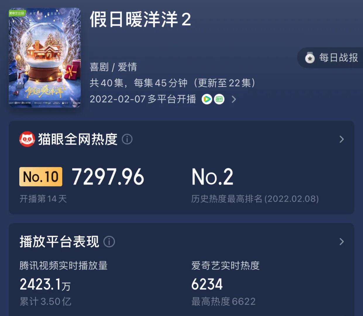 上線14天,雙平臺播出騰訊的累計播放量僅為3.5億,而愛奇藝熱度更是不佳。“撲街”成為了《假日暖洋洋2》的命運。