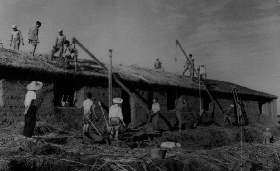 大家去到一個地方首先就是蓋房子,為了省錢省時,大多是採用乾打壘的辦法,把黏土放入兩塊木板之間夯實就行了。大家住的是土房子,吃的是粗糧野菜,建的是全國一流的企事業單位。