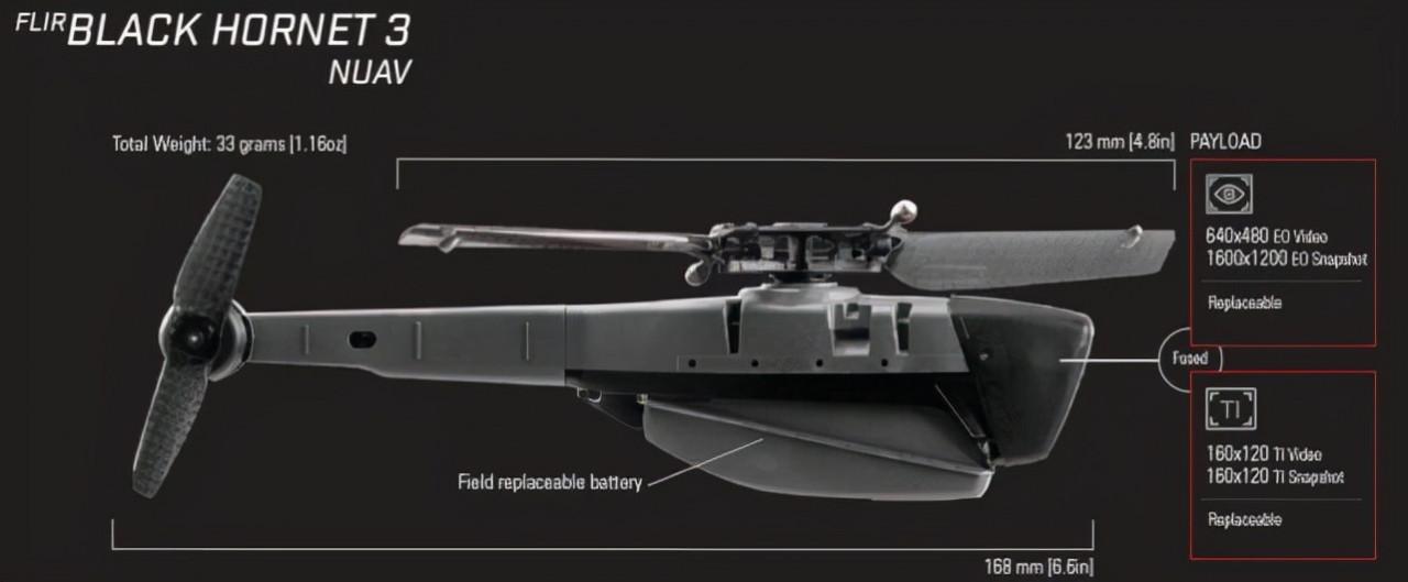 2016年12月,PD100做了比較大的改進,改進過的無人機長度不變,還是168毫米,重量卻從18克增加到32克。效能也得到進一步提升,最大續航時間從20分鐘增加到25分鐘,遙控傳輸距離從1000米提升至2000米,增加了光電感測器和熱成像攝像頭,可在夜間執行監視任務。“一分價錢一分貨”,每套“黑蜂3”偵察系統全重約1.3千克,包括2架“黑蜂3”無人機,1套控制裝置,售價卻高達19.5萬美元(2018年面值)!