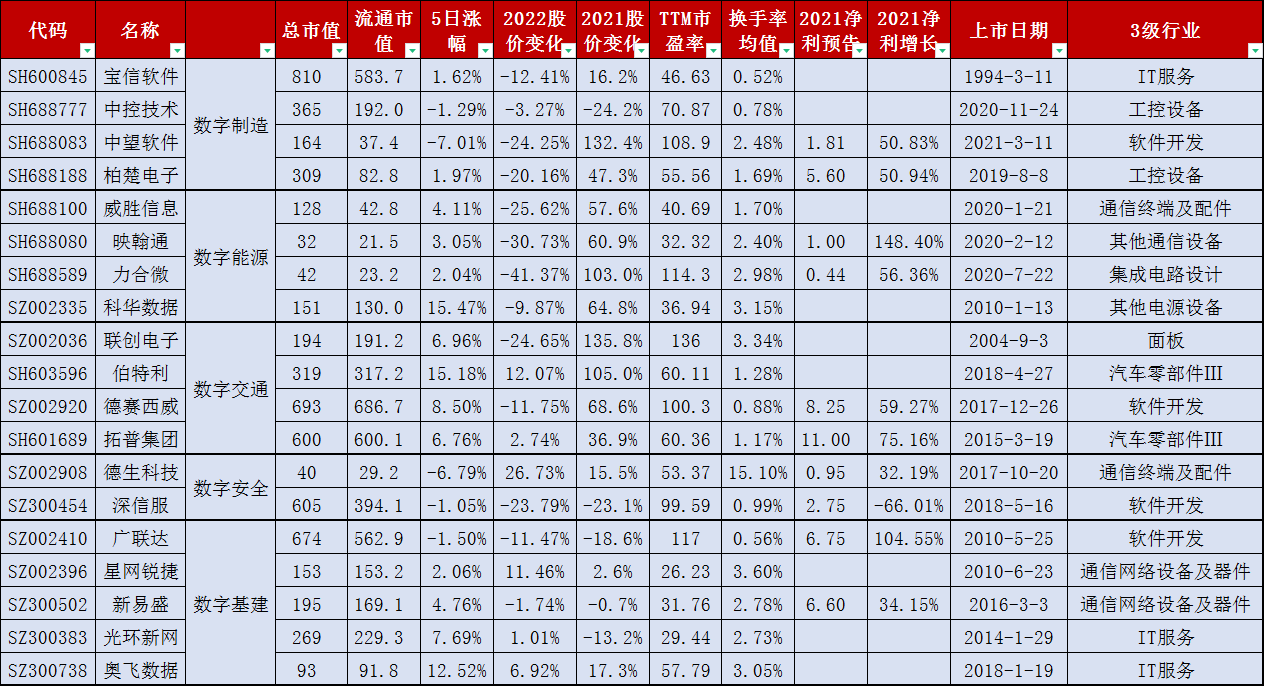 近期數字經濟政策出爐如雨後春筍般,本文從數字基建、數字製造、數字能源、數字交通、數字安全幾個方面結合國家政策挑選出數字經濟的部分核心資產名錄僅供參考,特徵如下: