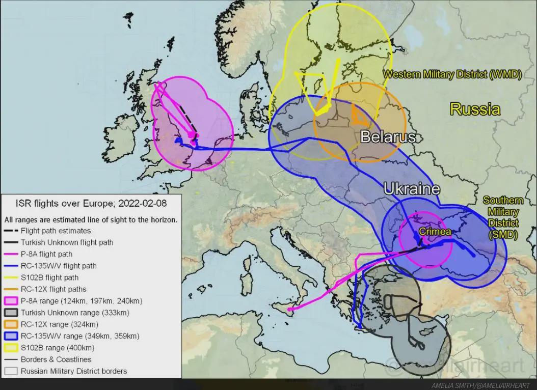 “戰區”認為,“鉚接”收集的有關情報可能對北約部隊非常有用。一些關鍵資料可能包括俄羅斯防空系統的位置和部署動態,以及與反介入/區域拒止 (A2/AD) 相關的其他武器系統的情況。上圖為使用開源資料製作的2022年2月8日的飛行地圖。美國空軍“鉚接”偵察機從米爾登霍爾基地和蘇達灣基地出發,在靠近白俄羅斯邊境、烏克蘭上空和克里米亞周邊海域進行偵察。