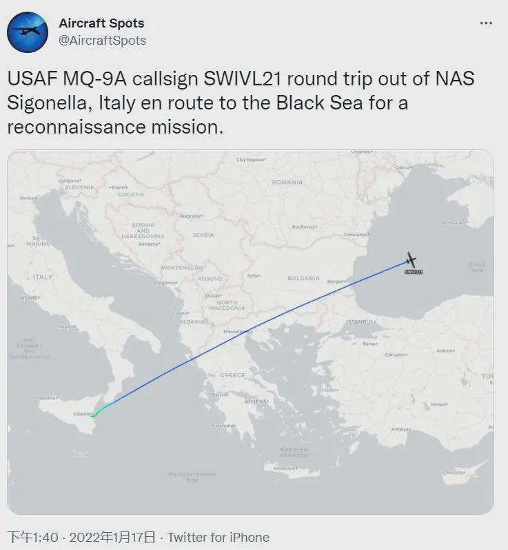 “飛機守望”1月17日釋出的訊息稱,一架呼號為SWIVL2的美國空軍“死神”無人機從義大利錫戈內拉空軍基地前往黑海執行偵察任務。