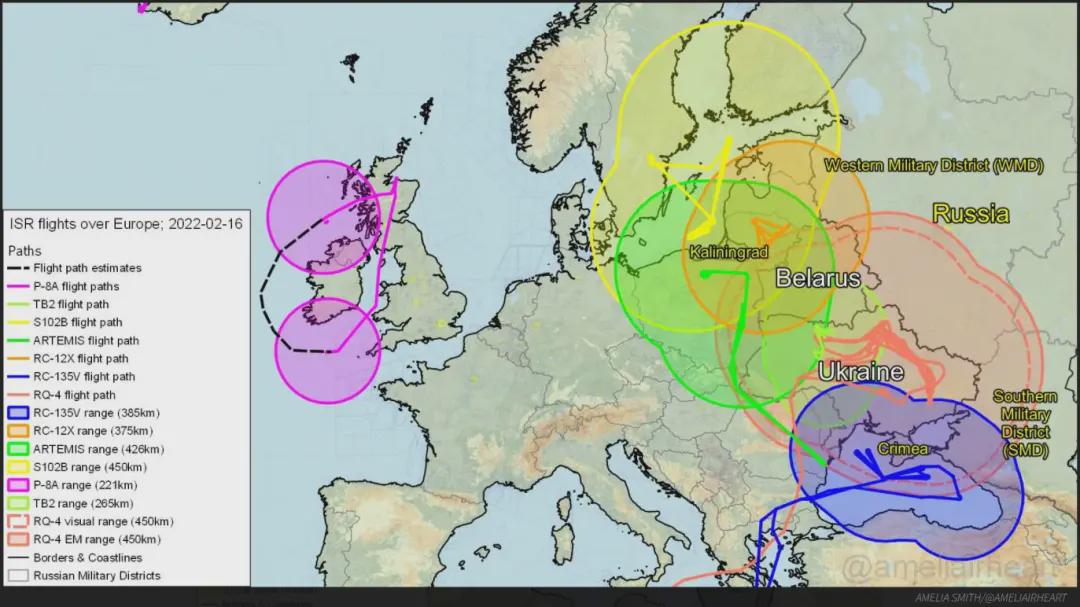 據“戰區”的文章介紹,很多空中情報收集活動是使用公開可用的飛行跟蹤軟體和一些開源情報綜合而成,其中包括推特賬號@ameliairheart整理的一系列飛行路線圖。比如,2月17日歐洲上空的監視和偵察情況:“今天,至少有 9 架北約和瑞典情報偵察機在歐洲上空飛行,其中包括美國海軍P-8A反潛機(PL16x、PL17x),美國空軍RQ-4無人偵察機(FORTE11、FORTE12)、戰略偵察機RC-135U(HOMER49),美國陸軍“阿爾忒彌斯”偵察機(BRIO68),英國皇家空軍偵察機RC-135W(RRR7234、RRR7217),瑞典S102B電子偵察機 (SVF622)。