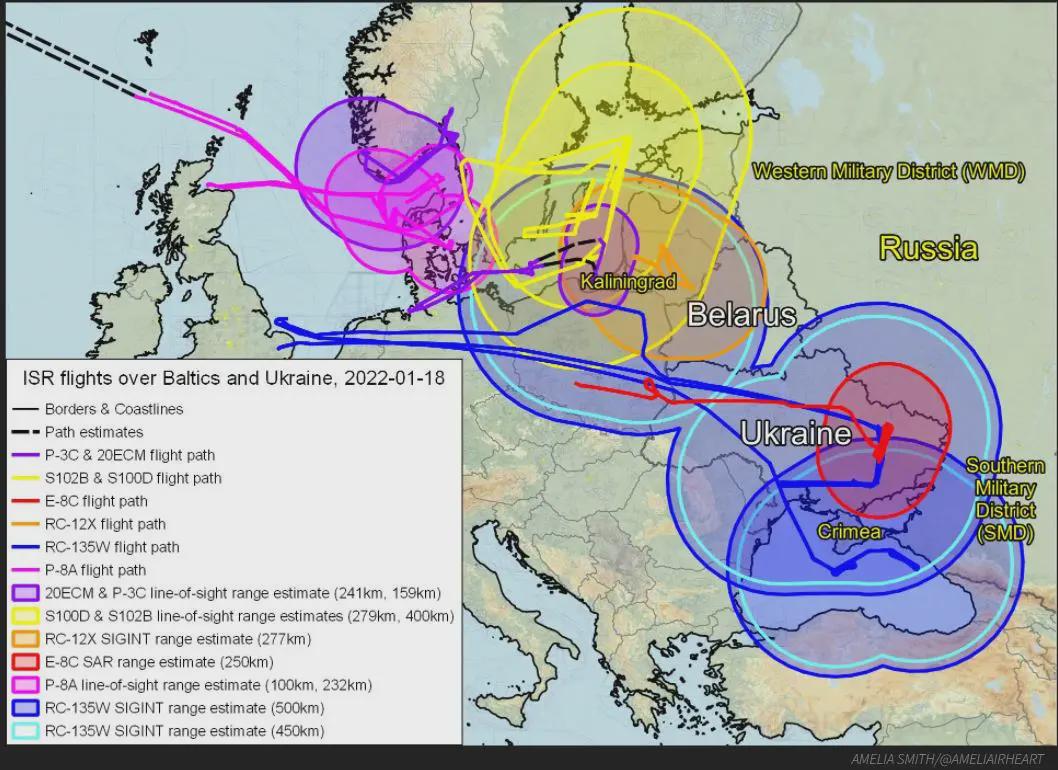 從該推特賬號釋出的偵察機飛行路線可以看到,北約偵察機主要圍繞烏克蘭周邊海空域巡航,飛行範圍、飛行強度之大令人咋舌。儘管這些飛行跟蹤資料並不完全準確,而且很容易受到欺騙,但最近的大量資料清楚地表明,北約和其他國家正在密切關注俄羅斯的部隊動向,目的是最大程度收集俄軍行動的情報,以預判可能的下一步行動。