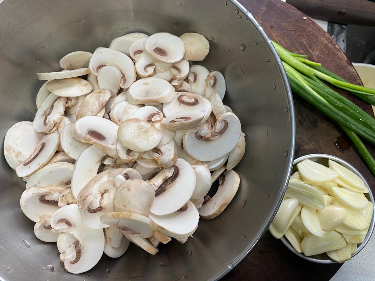 蘑菇洗淨切片,大蒜剝皮切片,蔥切蔥花備用。