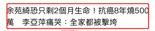 沒想到在萬般悲痛下,孩子還沒接受手術,餘宛綺自己就先出事了,她的癌症復發了。