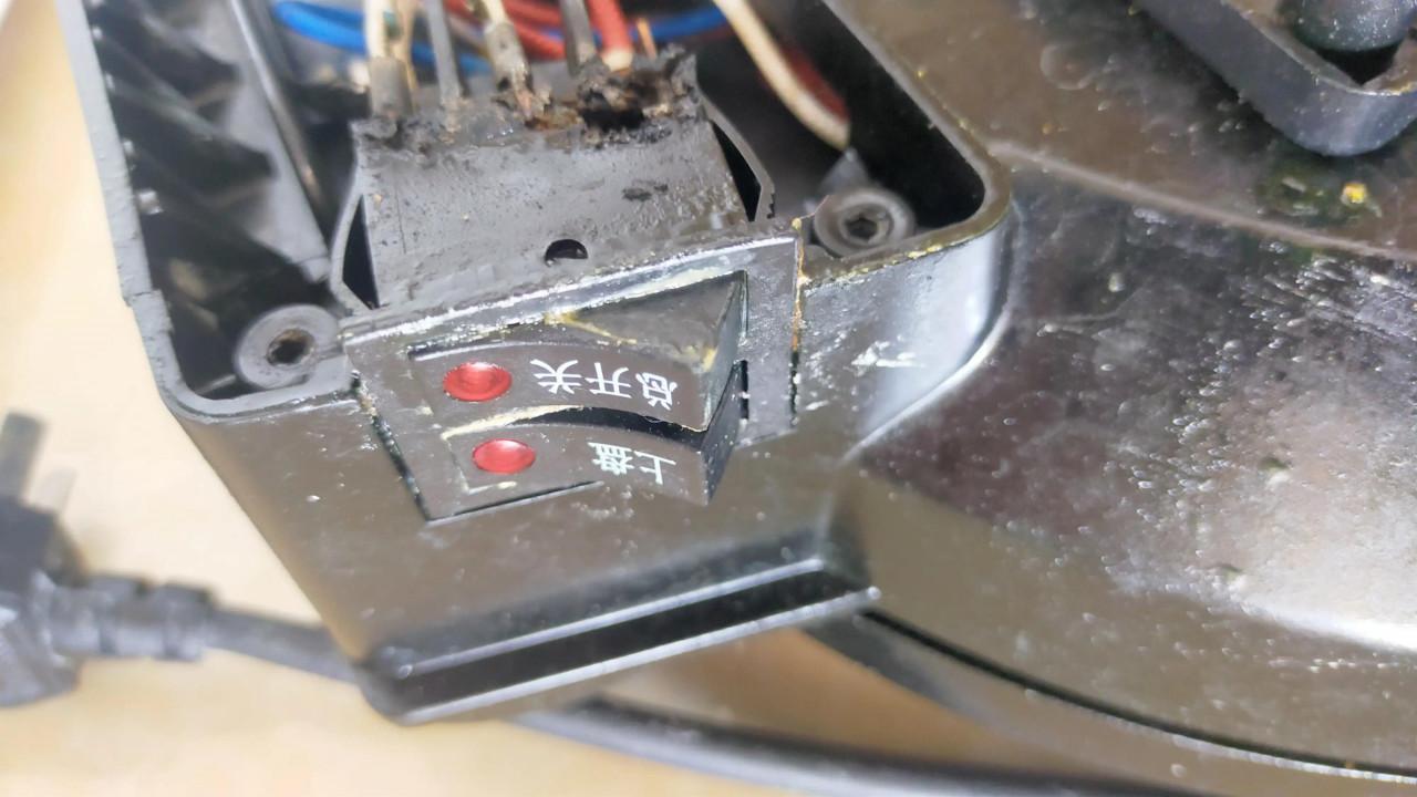 小編今天插上電餅鐺準備做個早餐,結果聽到電餅鐺滋滋響,憑經驗判斷我覺得應該是內部接觸不良。於是拆開發現了問題所在,原因是電餅鐺的船型開關內部接觸不良造成的打火。