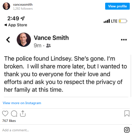 林賽失聯後,她的丈夫一直在社交網路釋出尋找林賽的最新訊息,警方確認林賽死亡的訊息後,林賽的丈夫在社交網路發文稱警方找到了林賽,她已經走了,表示自己得知這個訊息後,非常崩潰,並透露一切都還在調查中,無法透露過多的細節,還感謝了這些天一直幫助尋找並關心林賽的網友。