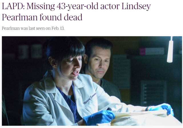 2月19日,據外媒報道,洛杉磯警方證實在當地時間週五發現的一具女屍確認是美國知名女演員林賽·艾琳·珀爾曼(Lindsey Erin Pearlman),屍體是在離林賽家3.5英里的山區發現的,警方並沒有透露死因,