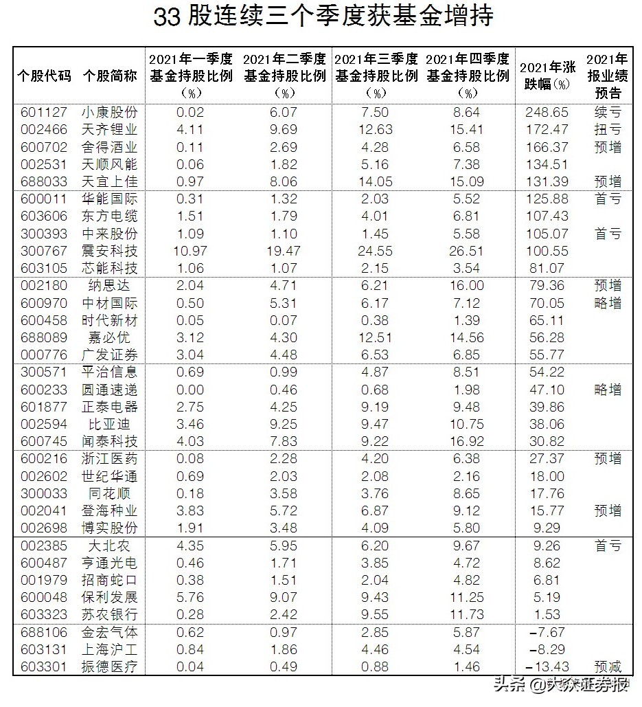 實際上,類似天宜上佳、捨得酒業和納思達這樣連續三個季度得到基金投資者青睞的個股並非孤例。據《大眾證券報》記者統計,2021年共有33只個股獲得基金投資者持續三個季度增倉,其中,震安科技的基金持股比例從2021年一季度末的10.97%激增至2021年四季度末的26.51%,增幅比例超過15%。此外,天宜上佳、納思達、聞泰科技、蘇農銀行、嘉必優、天齊鋰業等個股的基金持股比例也實現了10%以上的增長。