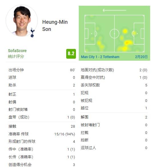 直播吧2月20日訊 熱刺客場對陣曼城的比賽,孫興慜貢獻兩次助攻第80分鐘被換下,在SofaScore中獲得8.2分。 孫興慜本場資料: 助攻:2次 射正:1次 傳球成功率:94%(15/16) 創造得分機會:3 解圍:2次