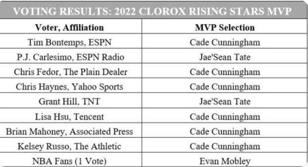 隨後新秀賽MVP投票公佈,凱德-康寧漢姆拿到9張投票中的6張,火箭前鋒傑肖恩-泰特拿到兩張投票,埃文-莫布里得到一張來自球迷的投票。
