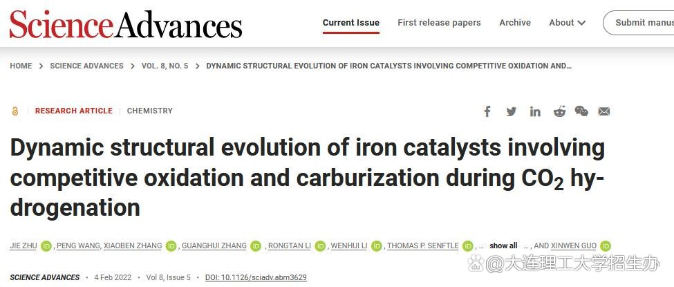 基於以上問題,精細化工國家重點實驗室、遼寧省“興遼英才計劃”高水平創新團隊郭新聞教授課題組,與美國萊斯大學Thomas Senftle教授、香港中文大學宋春山教授、大連化學物理研究所劉偉研究員、傅強研究員等課題組合作,在Science Advances發表了題為“Dynamic structural evolution of iron catalysts involving competitive oxidation and carburization during CO2 hydrogenation”的研究論文。