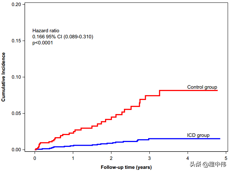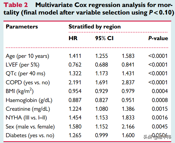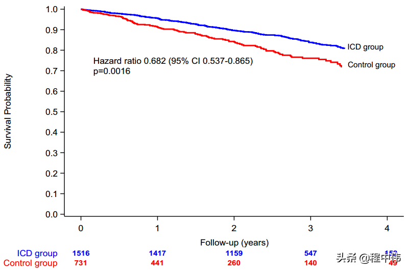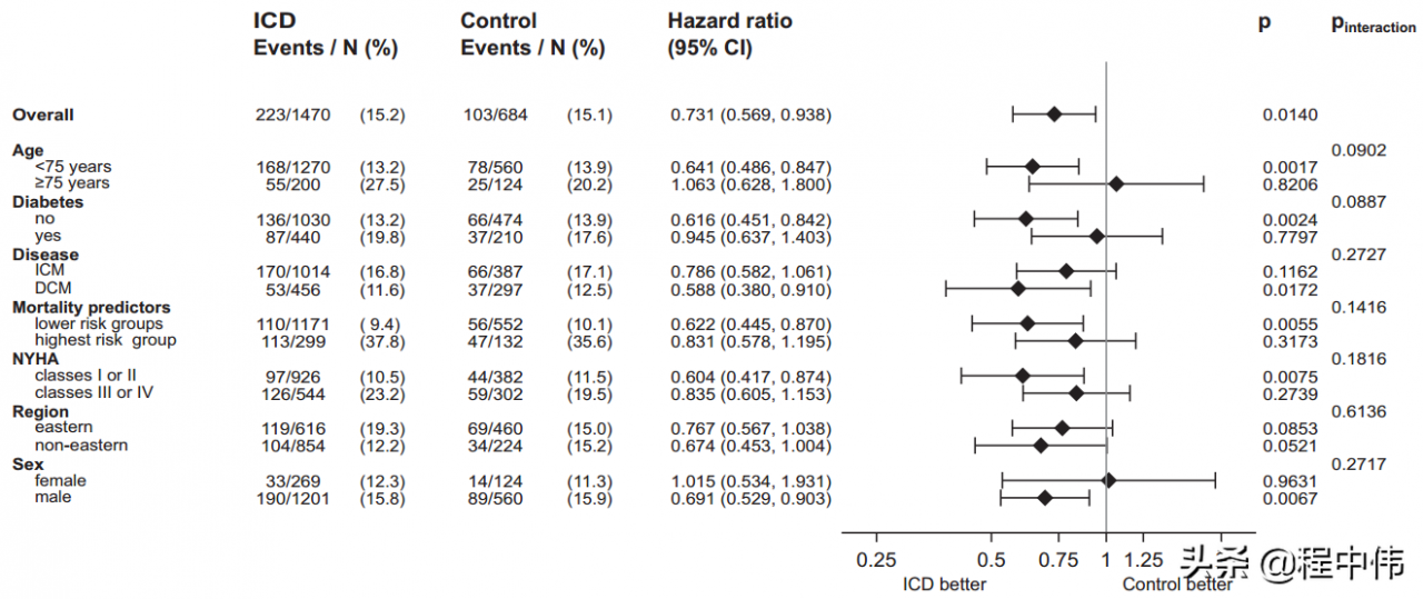 經過2.4 ± 1.1年隨訪,342例死亡(死亡率6.3%/年,ICD組和對照組分別為5.6%/年和9.2%/年),支援ICD降低死亡率(未校正HR 0.682,95% CI 0.537–0.865, P= 0.0016)。多因素分析表明,年齡、LVEF、NYHA < III級和COPD為死亡預測因子。校正相關因素後,與對照比較,ICD降低27%死亡率(HR 0.731, 95% CI 0.569–0.938, P= 0.0140)。亞組分析表明,糖尿病患者和年齡≥75歲患者未能從ICD植入獲益。