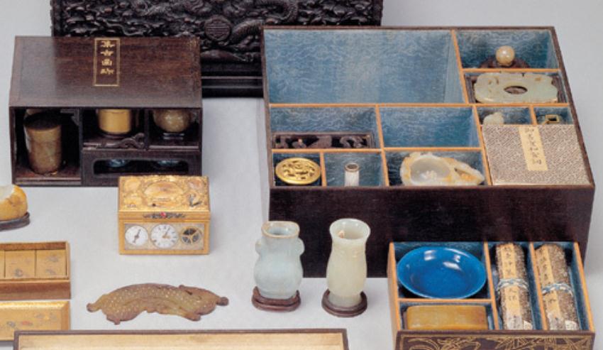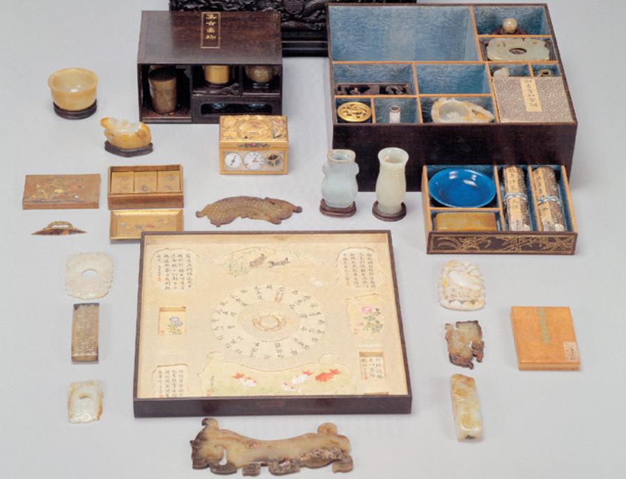 另外移開這個托盤,裡面可以清楚地看到有八九個大小不一的盒子,盒子內除了歷朝歷代的瓷碗、玉瓶、書畫等,還有來自日本的蒔繪盒。