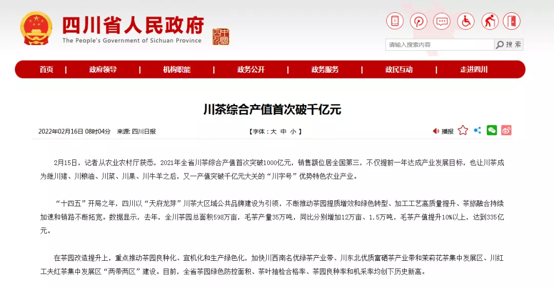 享有“蜀土茶稱聖”美譽的四川茶產業,愛喝茶是四川人的標籤之一。近日,四川省農業農村廳公佈:2021年四川省川茶綜合產值首次突破1000億元。