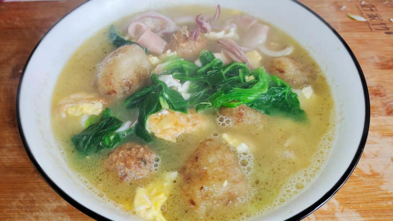 食材準備:菠菜,肉丸子,魷魚,雞蛋兩個,蔥花,香油,胡椒粉,食鹽,食用油