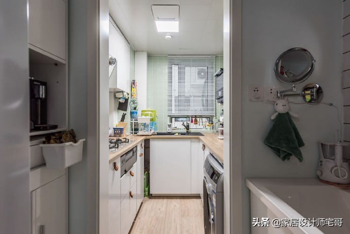 值得一提的是,衛生間的浴室櫃被移到了廚房的外側,讓衛生間充分做到了乾溼分離,對面還設計了一組收納櫃,中間鏤空做了西廚區,擺放了一臺咖啡機。