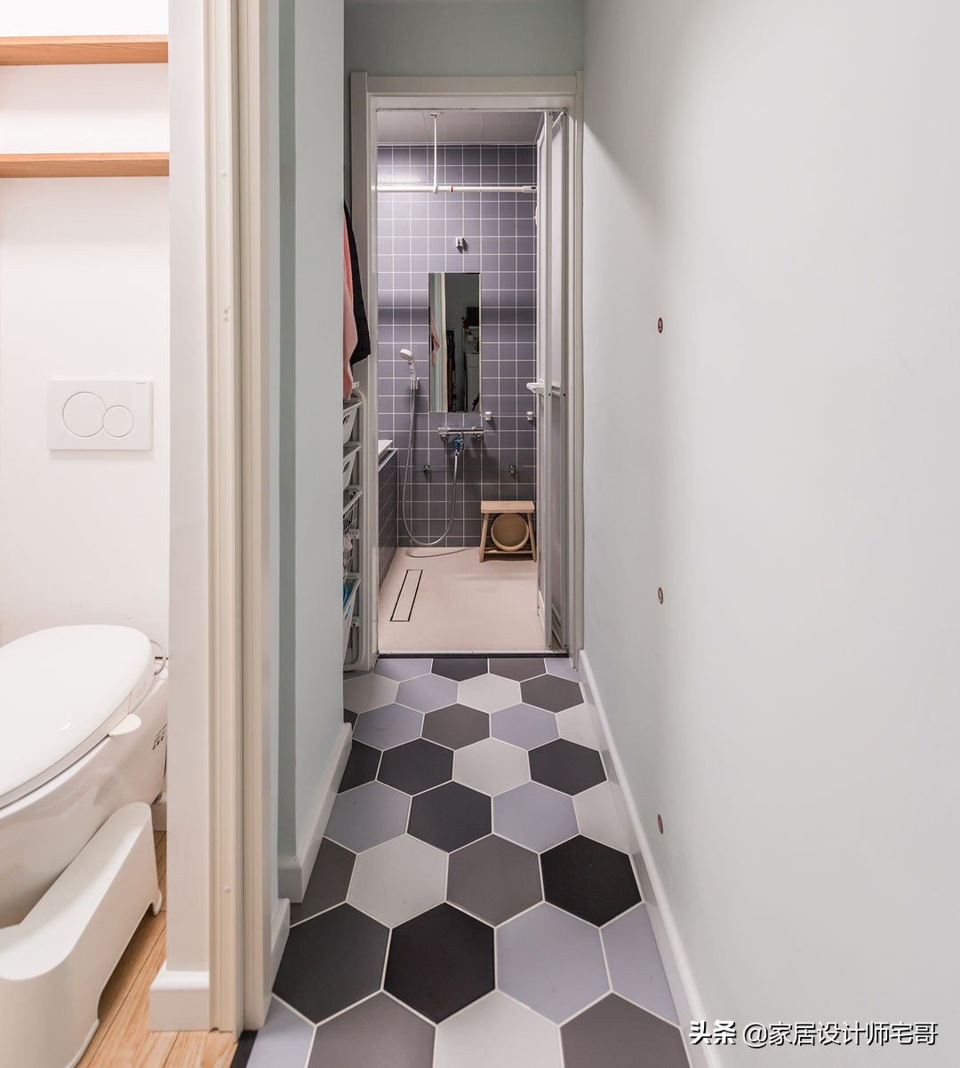 衛生間過道的地磚和玄關的六邊形地磚相呼應,顯得美觀又高潔。