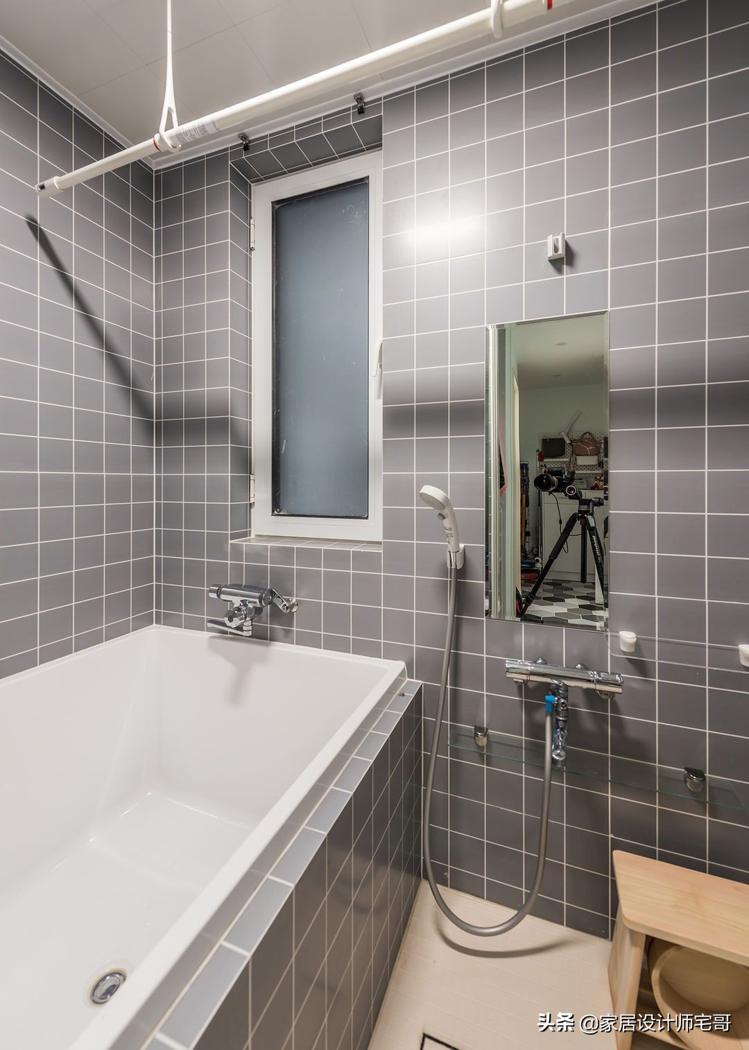 浴室內牆面上全部鋪貼了灰色的小方磚,這樣更加安全和方便收拾,也更加美觀。