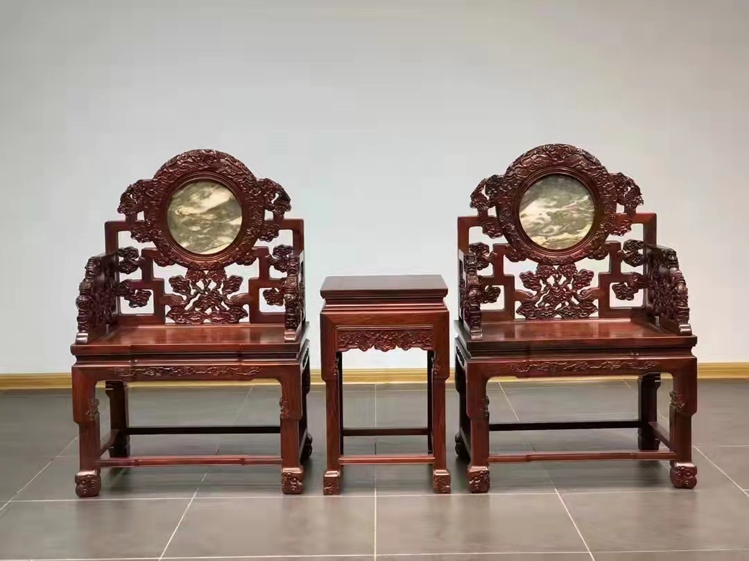 可以說這款以大紅酸枝材質製作的寶座,不管是在外型設計,還是在雕工方面,都是一件很不錯的產品。盡顯清式傢俱的莊嚴肅穆,氣韻富麗凝重,是廳堂擺設中頗為莊重的三件套寶座。