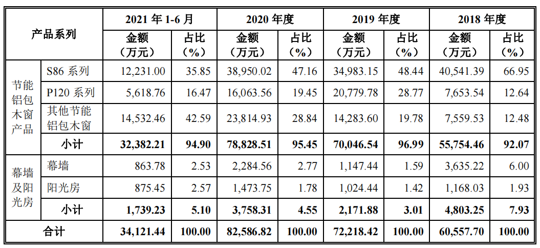 節能鋁包木窗實現的收入是公司主營業務收入的主要組成部分。報告期內,公司節能鋁包木窗分別實現收入5.575億元、7.005億元、7.883億元和3.238億元,佔主營業務收入比例分別為 92.07%、96.99%、95.45%和94.90%。公司目前主要聚焦於節能鋁包木窗業務,尚未大規模開展鋁合金、塑鋼等其他材質節能窗產品業務。同行業中,許多競爭對手採用多主業經營模式,同時生產斷橋鋁合金窗、塑鋼窗及節能鋁包木窗,與其相比,公司產品結構相對單一。