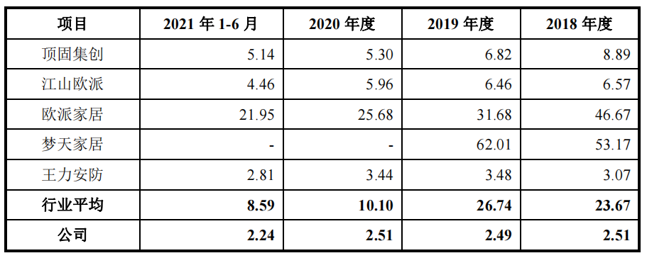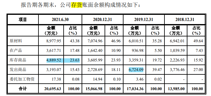 報告期各期末,森鷹窗業存貨賬面價值分別為1.375億元、1.669億元、1.453億元和1.976億元,佔流動資產總額的比例分別為29.97%、29.89%、25.89%和32.64%。報告期內,公司存貨週轉率分別為 3.28、2.90、3.20 和 2.73,公司存貨週轉率低於同行業可比公司平均值。而存貨規模恰恰也是上次IPO被否所關注到的問題,森鷹窗業的庫存商品在報告期內數額跟構成佔比顯著上升。