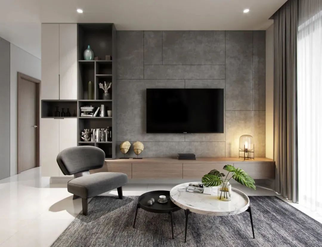 背景牆選用慕尼黑高定板不對稱圖形拼接工藝,左邊選用鐵灰到頂書櫃,一半開放式一半搭配白色櫃門,鳳凰翅木紋色懸掛式電視櫃整潔收納播放裝置,讓簡單的黑白灰多了生活的溫度;懸掛式電視櫃有效利用了客廳的空間面積,給掃地機器人留出足夠多的安放空間。