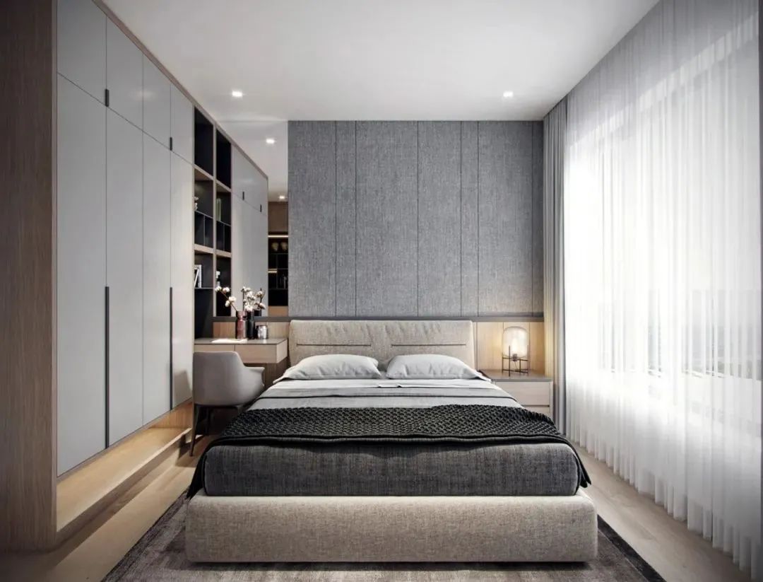 床頭護牆板選用灰色布藝軟包,隔音又有溫度,書桌區域裝上一面大鏡子,讓簡易化妝臺更完美,臥室也更寬敞。