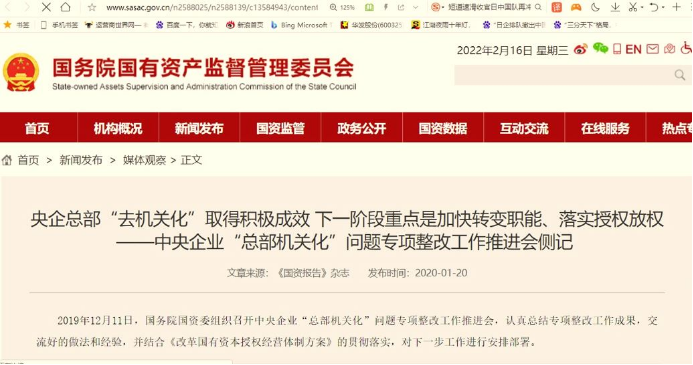 比如國家國資委所屬的《國資報告》雜誌2020年1月就刊登文章稱:各中央企業快速行動,及時調整“廳、局”等機構名稱,以及“局長、巡視員、調研員”等職務稱謂。目前,67家設定“辦公廳”的企業全部完成了名稱調整,其中,48家改為辦公室、19家改為綜合(管理)部。14家設定“局”的企業也全部調整了名稱。
