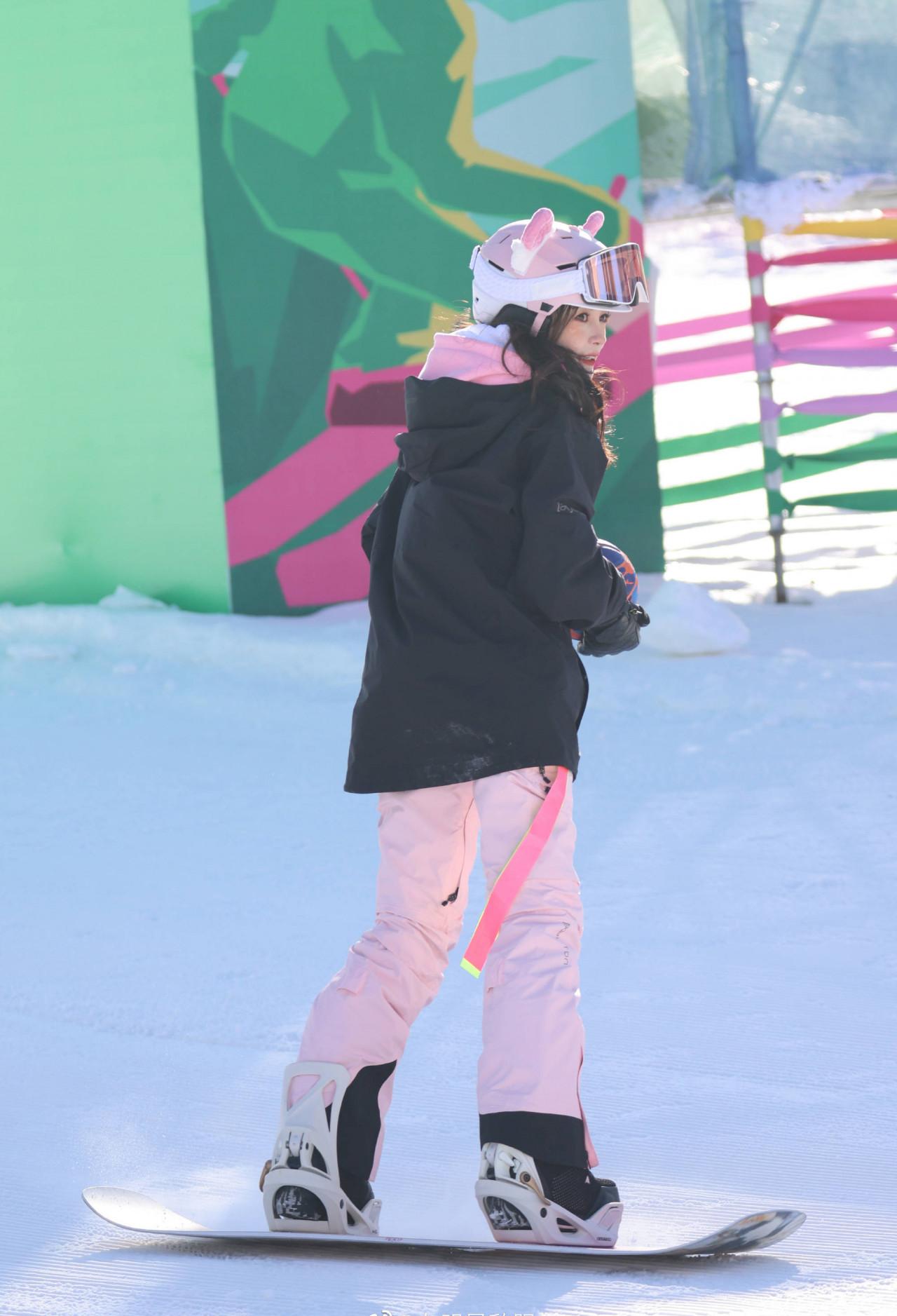 楊穎粉色頭盔配粉色褲子,時尚感十足。