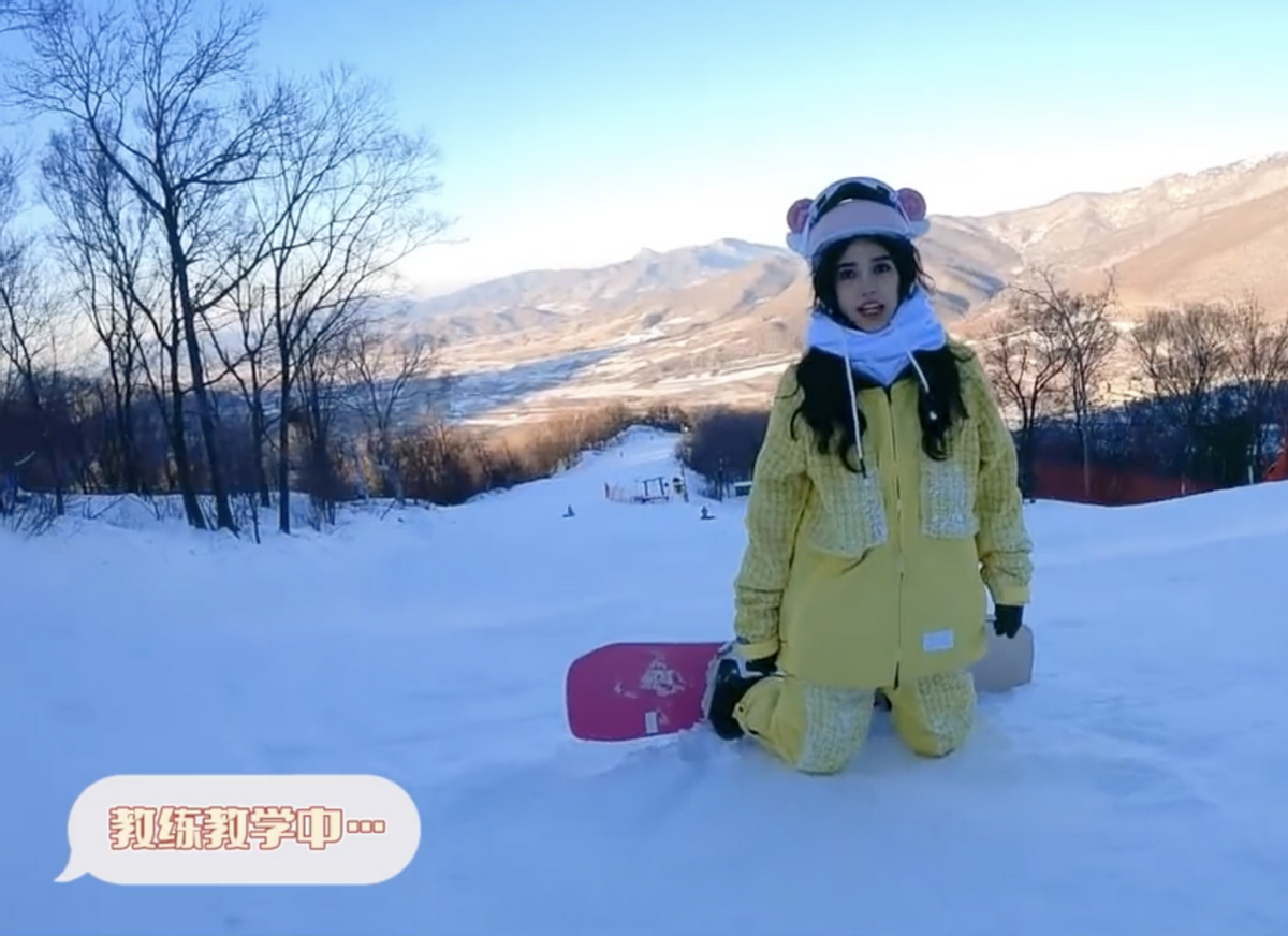 在影片中,楊穎剛開始嘗試滑雪時看起來並不熟練,直接重重地摔在雪地上,雪地上的雪粒直接被弄的飛揚起來。